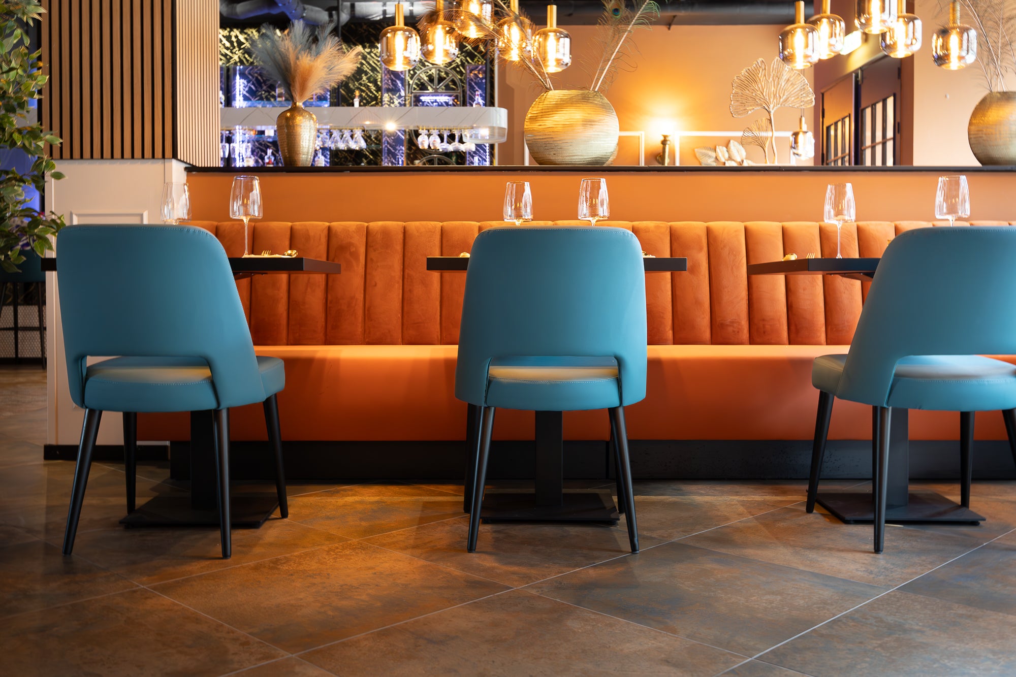 Voor dit moderne Indiase restaurant in Almere ontwierpen en produceerden wij het complete interieur op maat. Van luxueuze horecabanken met verticale banen tot een stijlvolle maatwerk bar, tafels, stoelen en afwerkingen in warme kleuren en rijke stoffen – alles is tot in detail afgestemd op de sfeer en routing van het restaurant.