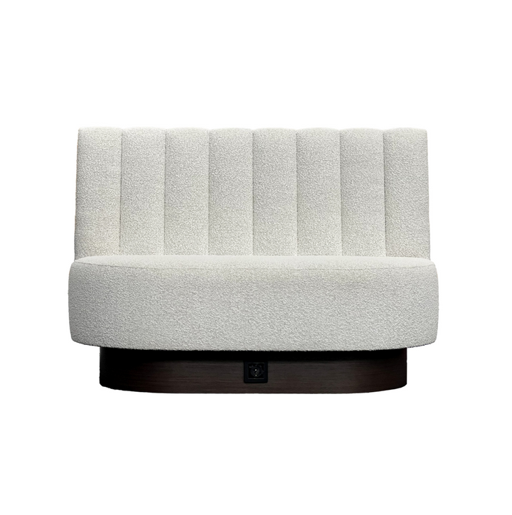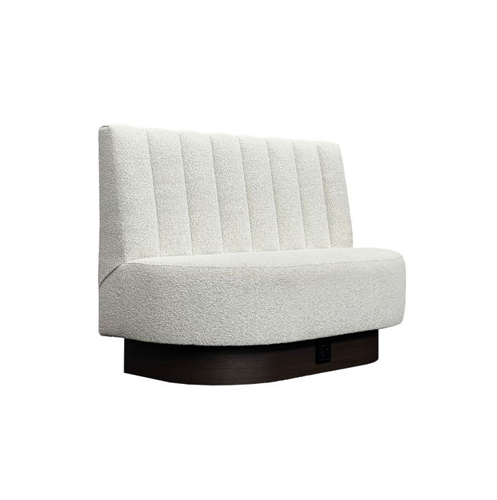 Luxe horecabank in zachte bouclé stof met verticale stiknaden en donker houten plint. Comfort en stijl, perfect voor moderne horeca inrichting.