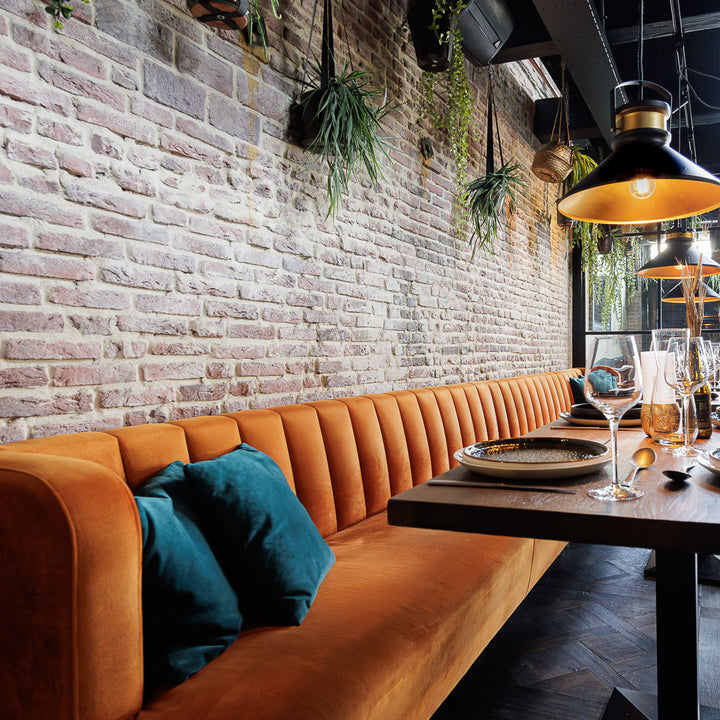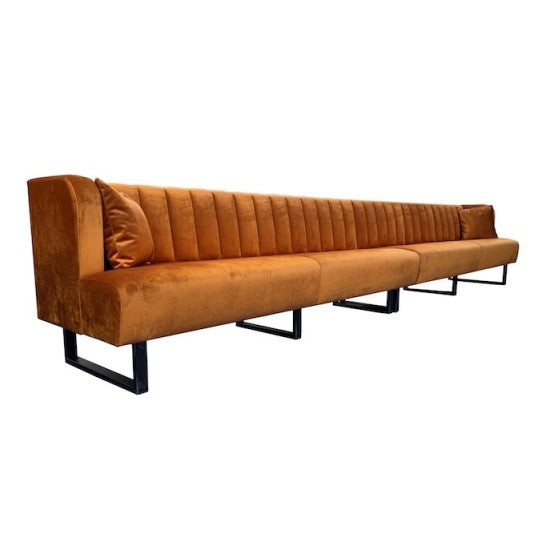 Lange horecabank in warme fluwelen stof met verticale stiknaden, zwart metalen sledepoten en sierkussens. Luxe maatwerk voor moderne horeca inrichting.