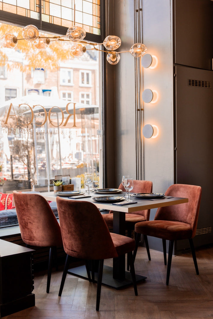 Veelzijdige horecastoel op maat met volledig gestoffeerde zitschaal en beukenhouten poten. Ontwerp zelf stijl, stof en afwerking — helemaal passend in jouw horeca inrichting.
